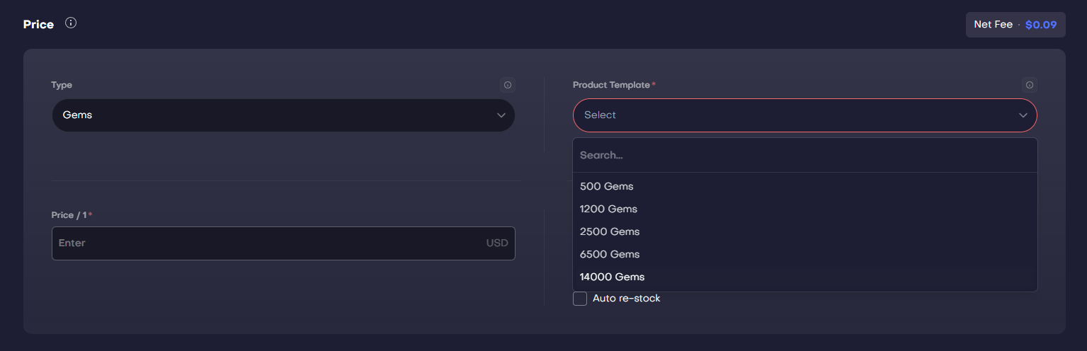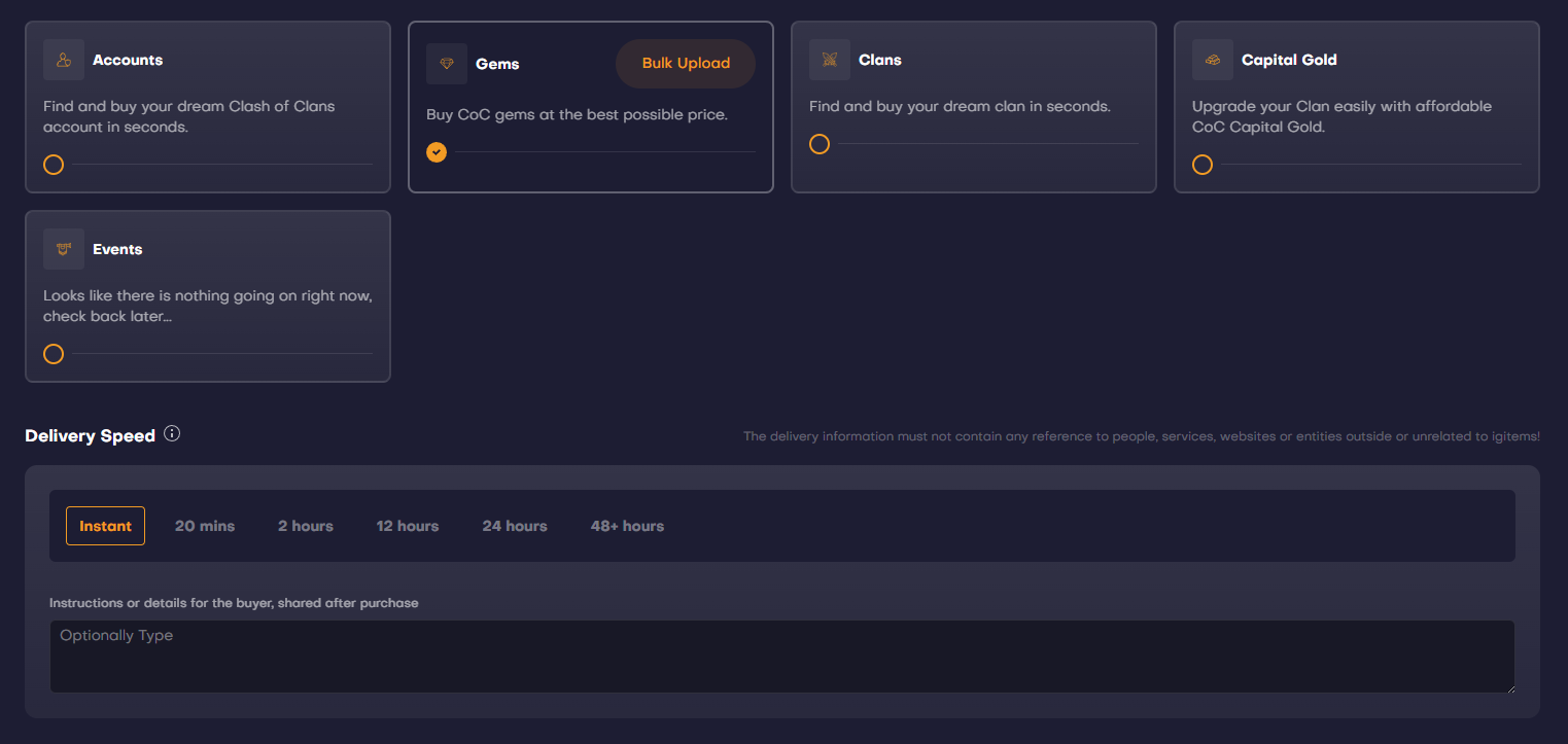Unlike for most product types, such as accounts or classic items, in some categories you can’t freely upload anything to, only what is already set up by igitems. In these categories, igitems would upload offer templates with a fixed title, image & certain filters already selected.