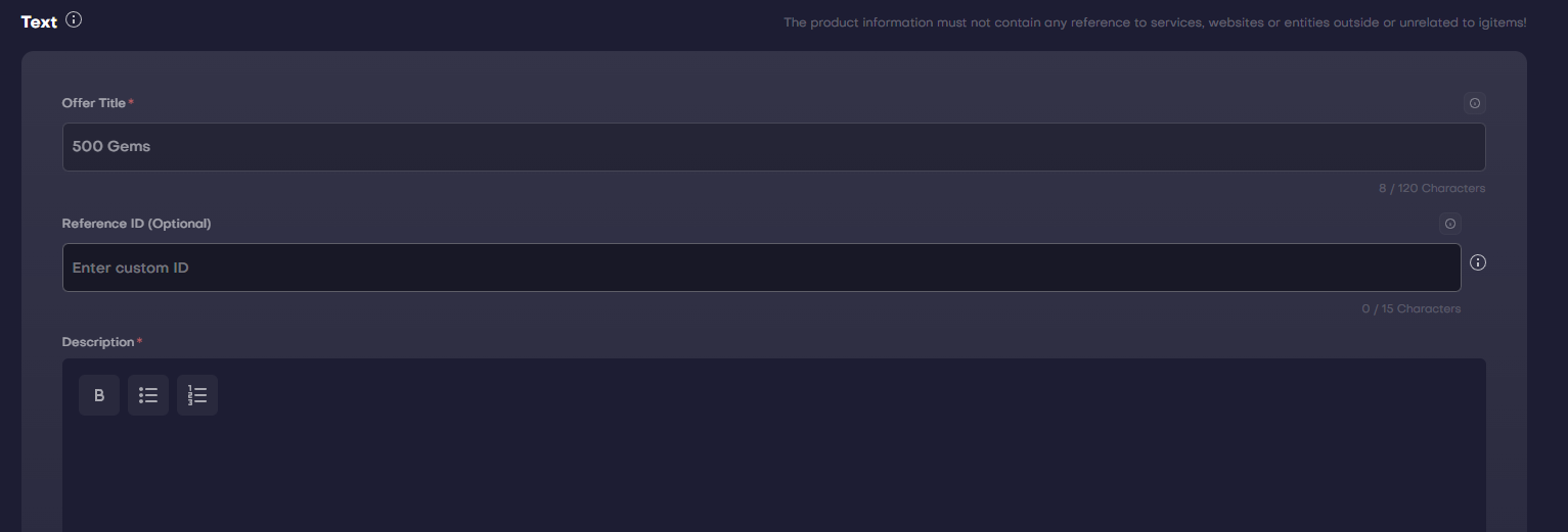⚠️You may NOT provide a description that goes against the idea of the template you uploaded offers to! (For example: If you uploaded an offer for Fortnite VBucks through Topup delivery, you can’t advertise it in the description as an account or gift card!)